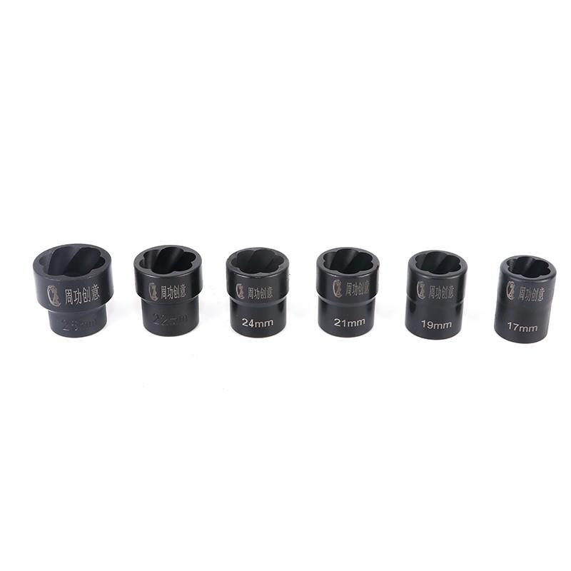 周功疑難螺絲拆卸輔助六件套是周功疑難螺絲拆卸器的輔助工具。本公司根據(jù)市場(chǎng)及客戶要求自主研發(fā)的一種集經(jīng)濟(jì)、高效、實(shí)用新型拆卸汽車(小轎車)防盜螺絲及普通螺絲拆卸專用套筒。周功疑難螺絲拆卸八件套包含17-26珞鉬鋼反牙套筒、可伸縮扳手。路虎專用套筒、市面上的螺絲如平面帶凹槽、內(nèi)置式帶花鍵的、冒式防盜螺絲或普通螺絲外圓滑牙就用相對(duì)應(yīng)的套筒,輕松搞定。
